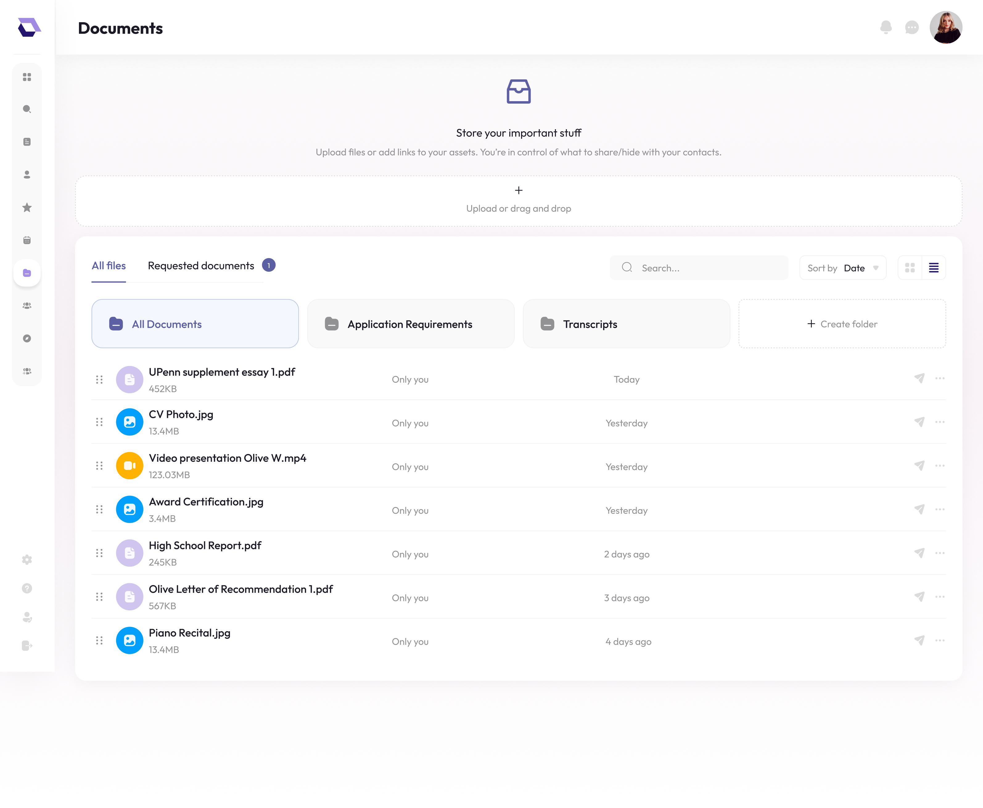 Stay up to date on admissions requirements, organize documents, and follow upcoming deadlines. Open is made to give you deeper insights into your student’s journey.