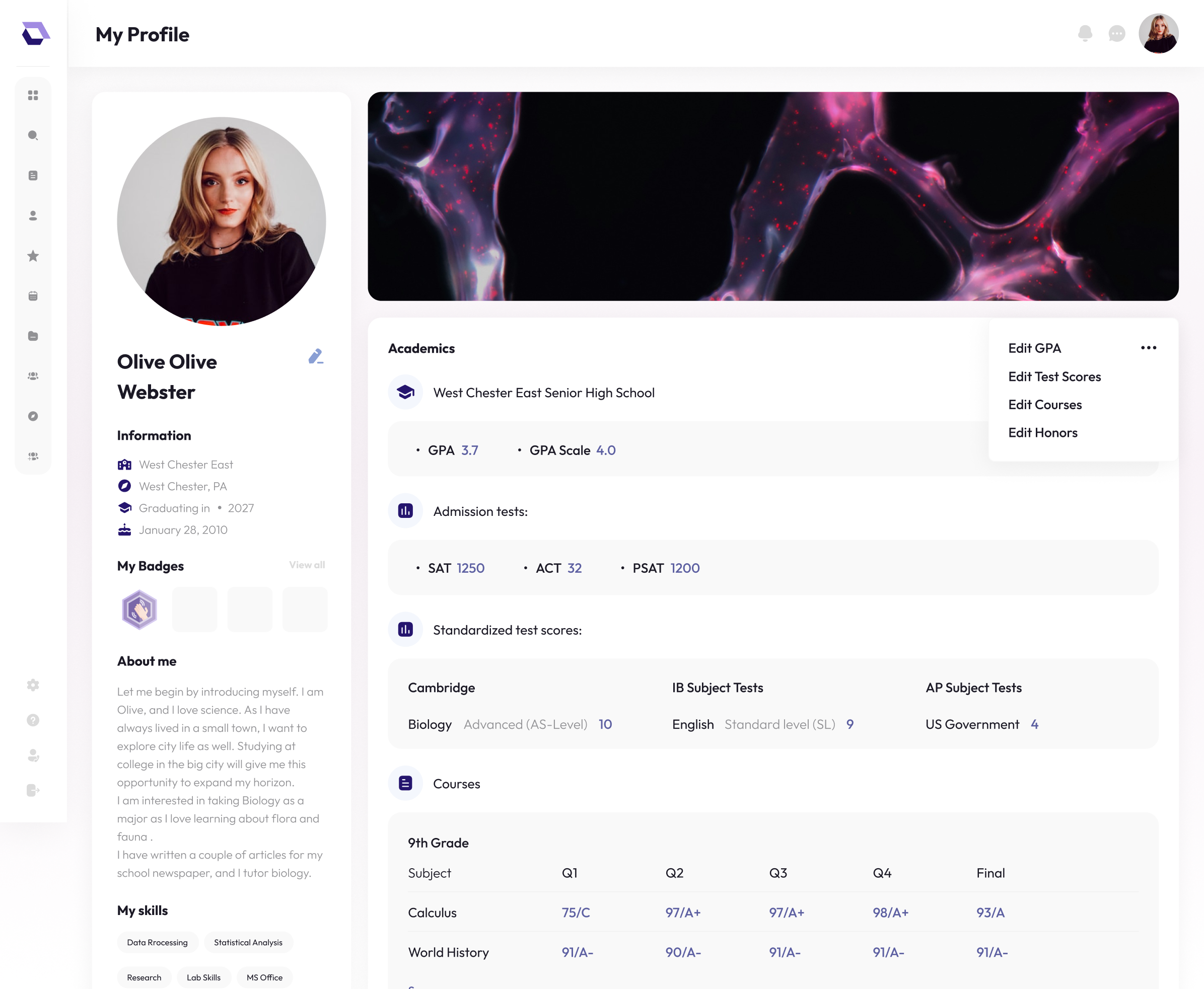Your personalized space, crafted by you. With an admissions-ready page, showcase everything you need to stand out and succeed.